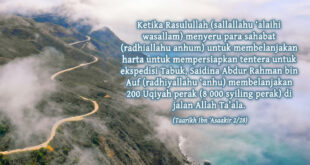 لما حضّ رسول الله صلى الله عليه وسلم الصحابة رضي الله عنهم على الإنفاق تجهيزا للجيش لغزوة تبوك، أنفق سيدنا عبد الرحمن بن عوف رضي الله عنه مائتي أوقية (ثمانية آلاف درهم) في سبيل الله. (من تاريخ ابن عساكر ٢/٢٨) Ketika Rasulullah (sallallahu ‘alaihi wasallam) menyeru para sahabat (radhiallahu anhum) …