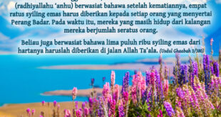 أوصى سيدنا عبد الرحمن بن عوف رضي الله عنه لكل من شهد بدرا بأربعمائة دينار، فكانوا مائة رجل (كان مائة من أهل بدر أحياء عند وفاته). وكذلك أوصى بخمسين ألف دينار فِي سبيل اللّه. (من أسد الغابة ٣/٣٨٠) Sebelum meninggal dunia, Saidina Abdur Rahmaan bin Auf (radhiyallahu ‘anhu) berwasiat bahawa …