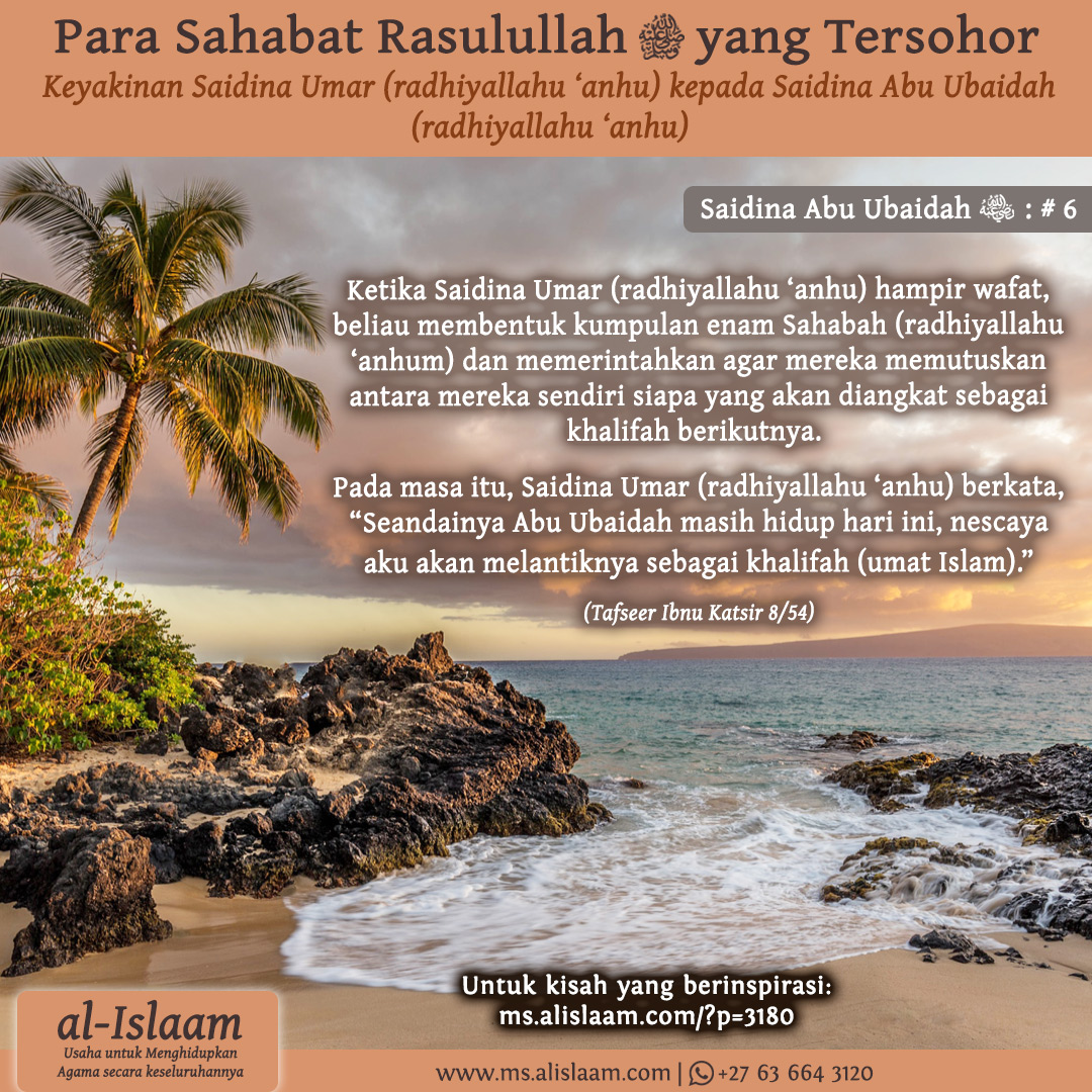 Saidina Umar (radhiyallahu ‘anhu) berkata, “Seandainya kematian datang kepadaku ketika Abu ‘Ubaidah bin Jarraah (radhiyallahu ‘anhu) masih hidup, maka aku akan melantiknya sebagai khalifah selepasku, dan jika Allah Ta’ala bertanya kepadaku, ‘Mengapa kamu melantik Abu Ubaidah (radhiyallahu ‘anhu) sebagai khalifah? Aku akan katakan kepada Allah Ta’ala sebab aku melantiknya adalah kerana aku pernah mendengar Rasulullah (sallallahu alaihi wasallam) menyebut, “Setiap Nabi mempunyai pengikut yang boleh dipercayai (dari umatnya) dan pengikut aku yang boleh dipercayai (atas umatku) adalah Abu Ubaidah bin Jarraah (radhiyallahu ‘anhu).” (Musnad Ahmad #108)