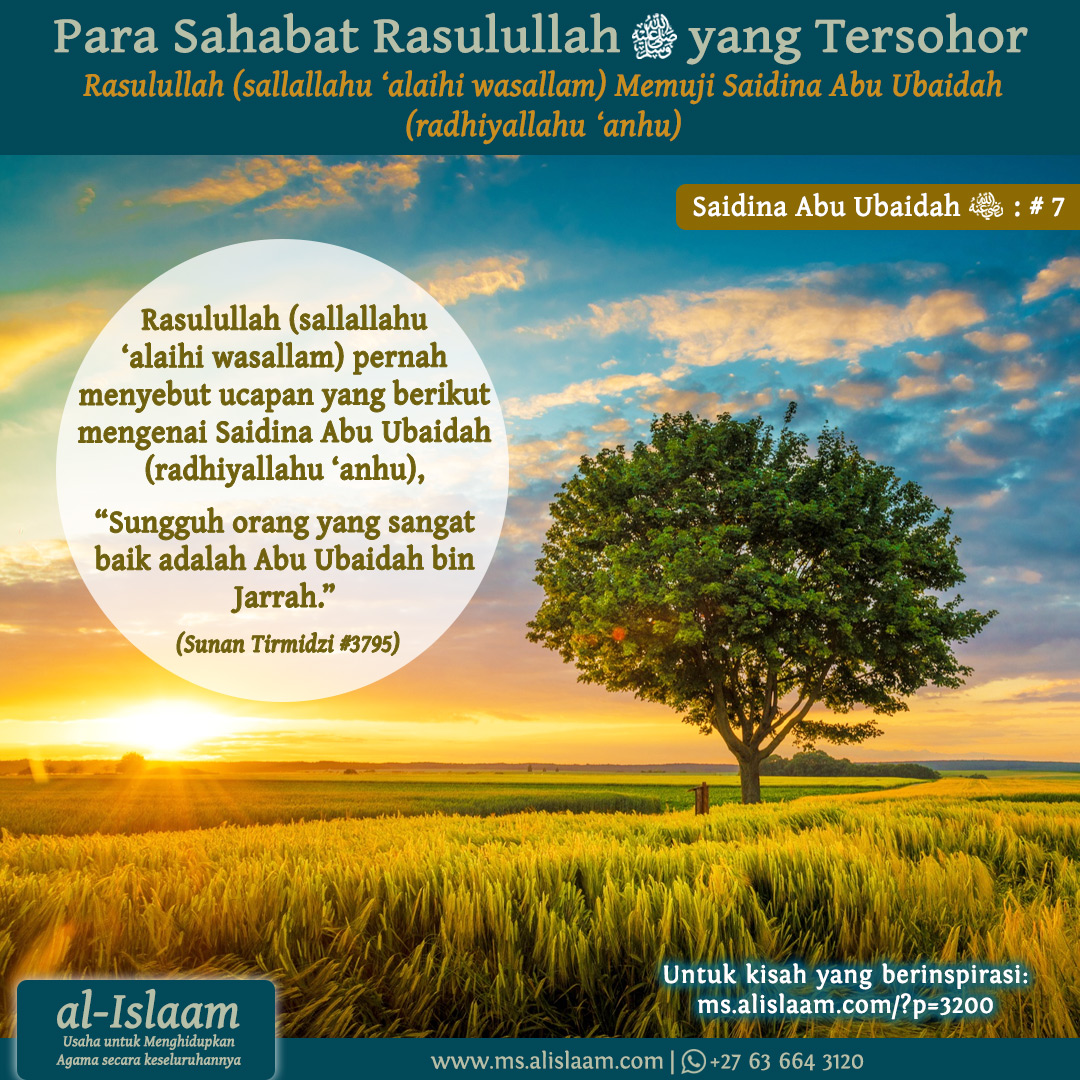 Rasulullah (sallallahu ‘alaihi wasallam) pernah menyebut ucapan yang berikut mengenai Saidina Abu Ubaidah (radhiyallahu ‘anhu), “Sungguh orang yang sangat baik adalah Abu Ubaidah bin Jarrah.” (Sunan Tirmidzi #3795)