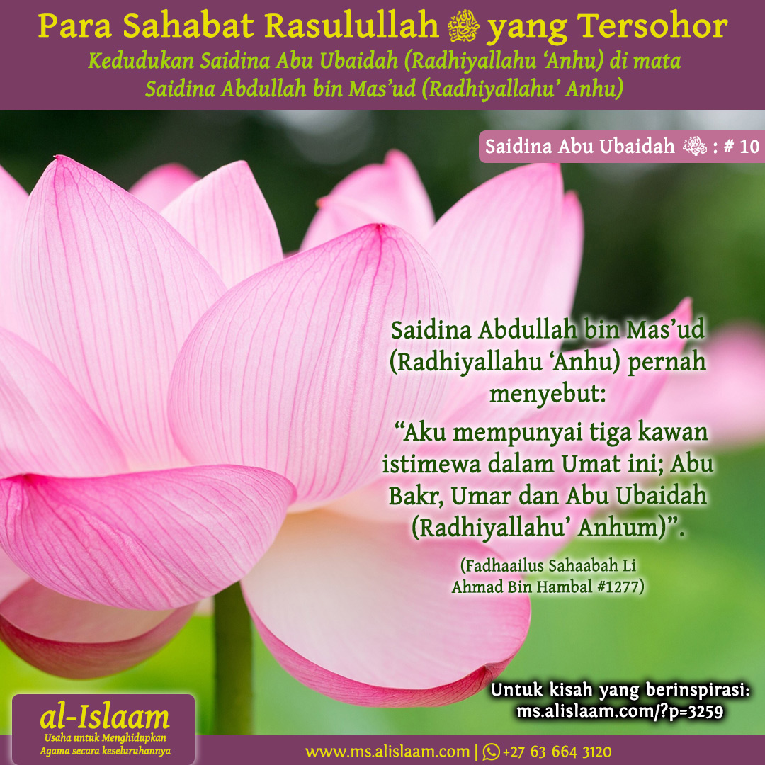 Saidina Abdullah bin Mas’ud (Radhiyallahu ‘Anhu) pernah menyebut, “Aku mempunyai tiga kawan istimewa dalam Umat ini; Abu Bakr, Umar dan Abu Ubaidah (Radhiyallahu’ Anhum)”. (Fadhaailus Sahaabah Li Ahmad Bin Hambal #1277)