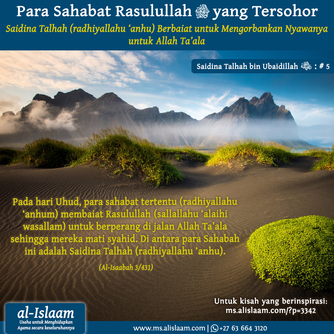 Pada hari Uhud, para sahabat tertentu (radhiyallahu ‘anhum) membaiat Rasulullah (sallallahu ‘alaihi wasallam) untuk berperang di jalan Allah Ta’ala sehingga mereka mati syahid. Di antara para Sahabah ini adalah Saidina Talhah (radhiyallahu ‘anhu). (Al-Isaabah 3/431)