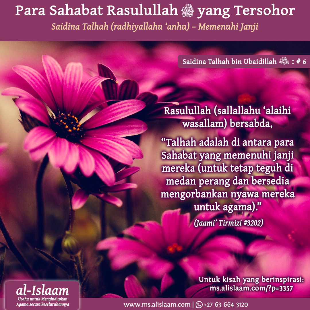 Rasulullah (sallallahu ‘alaihi wasallam) bersabda, “Talhah adalah di antara para Sahabat yang memenuhi janji mereka (untuk tetap teguh di medan perang dan bersedia mengorbankan nyawa mereka untuk agama).” (Jaami’ Tirmizi #3202)