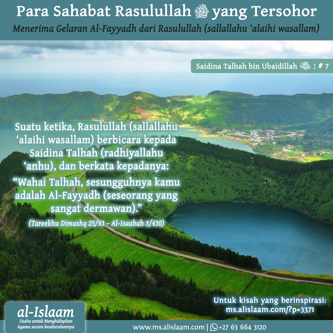 “Wahai Talhah, sesungguhnya kamu adalah Al-Fayyadh (seseorang yang sangat dermawan).” (Tareekhu Dimashq 25/93 – Al-Isaabah 3/430)