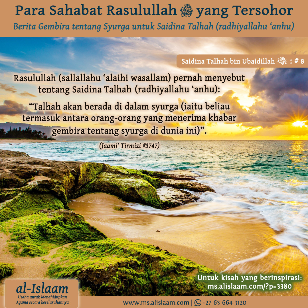 “Talhah akan berada di dalam syurga (iaitu beliau termasuk antara orang-orang yang menerima khabar gembira tentang syurga di dunia ini)”. (Jaami’ Tirmizi #3747)