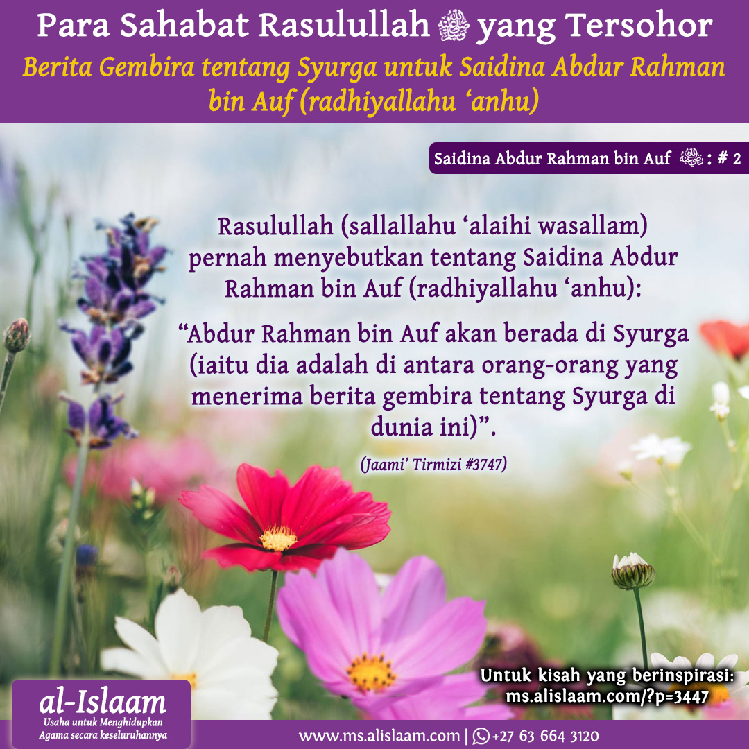 “Abdur Rahman bin Auf akan berada di Syurga (iaitu dia adalah di antara orang-orang yang menerima berita gembira tentang Syurga di dunia ini)”. (Jaami’ Tirmizi #3747)