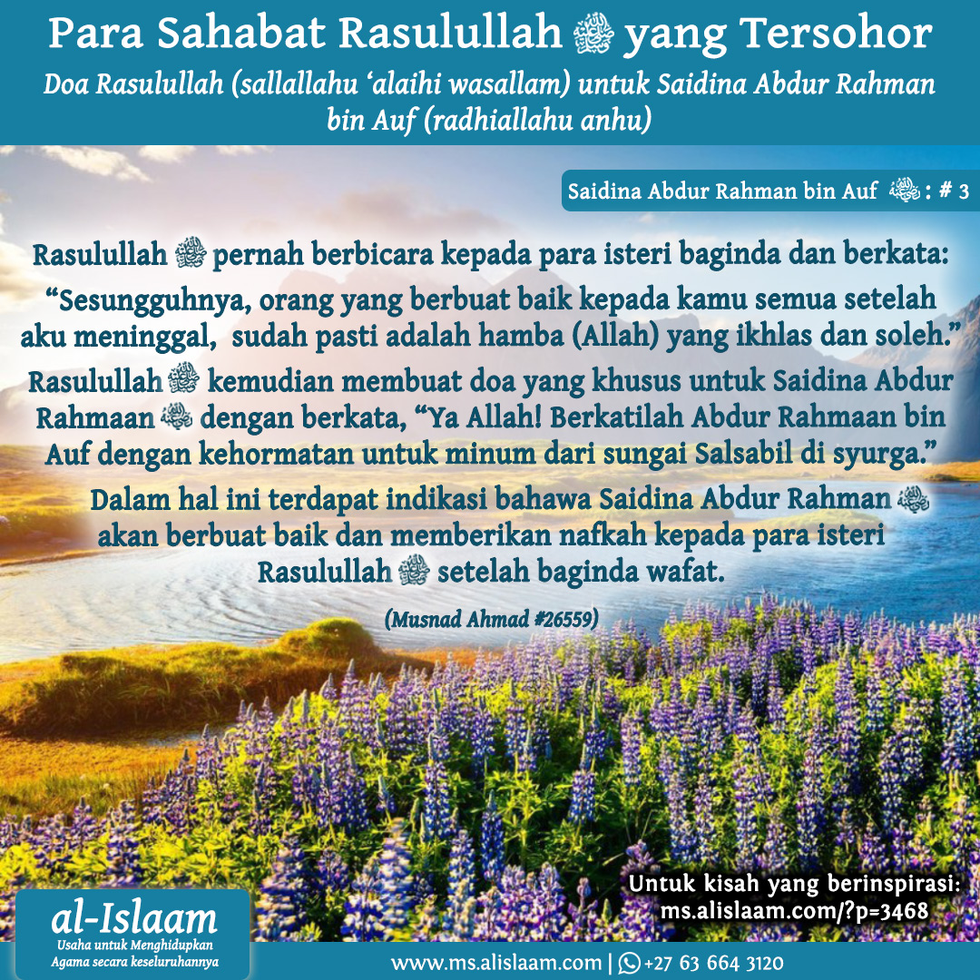 Rasulullah (sallallahu ‘alaihi wasallam) kemudian membuat doa yang khusus untuk Saidina Abdur Rahmaan (radhiallahu anhu) dengan berkata, “Ya Allah! Berkatilah Abdur Rahmaan bin Auf dengan kehormatan untuk minum dari sungai Salsabil di syurga.”