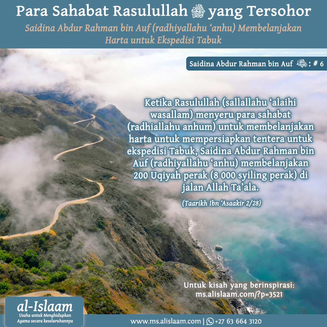 Ketika Rasulullah (sallallahu ‘alaihi wasallam) menyeru para sahabat (radhiallahu anhum) untuk membelanjakan harta untuk mempersiapkan tentera untuk ekspedisi Tabuk, Saidina Abdur Rahman bin Auf (radhiyallahu ‘anhu) membelanjakan 200 Uqiyah perak (8 000 syiling perak) di jalan Allah Ta’ala. (Taarikh Ibn ‘Asaakir 2/28)