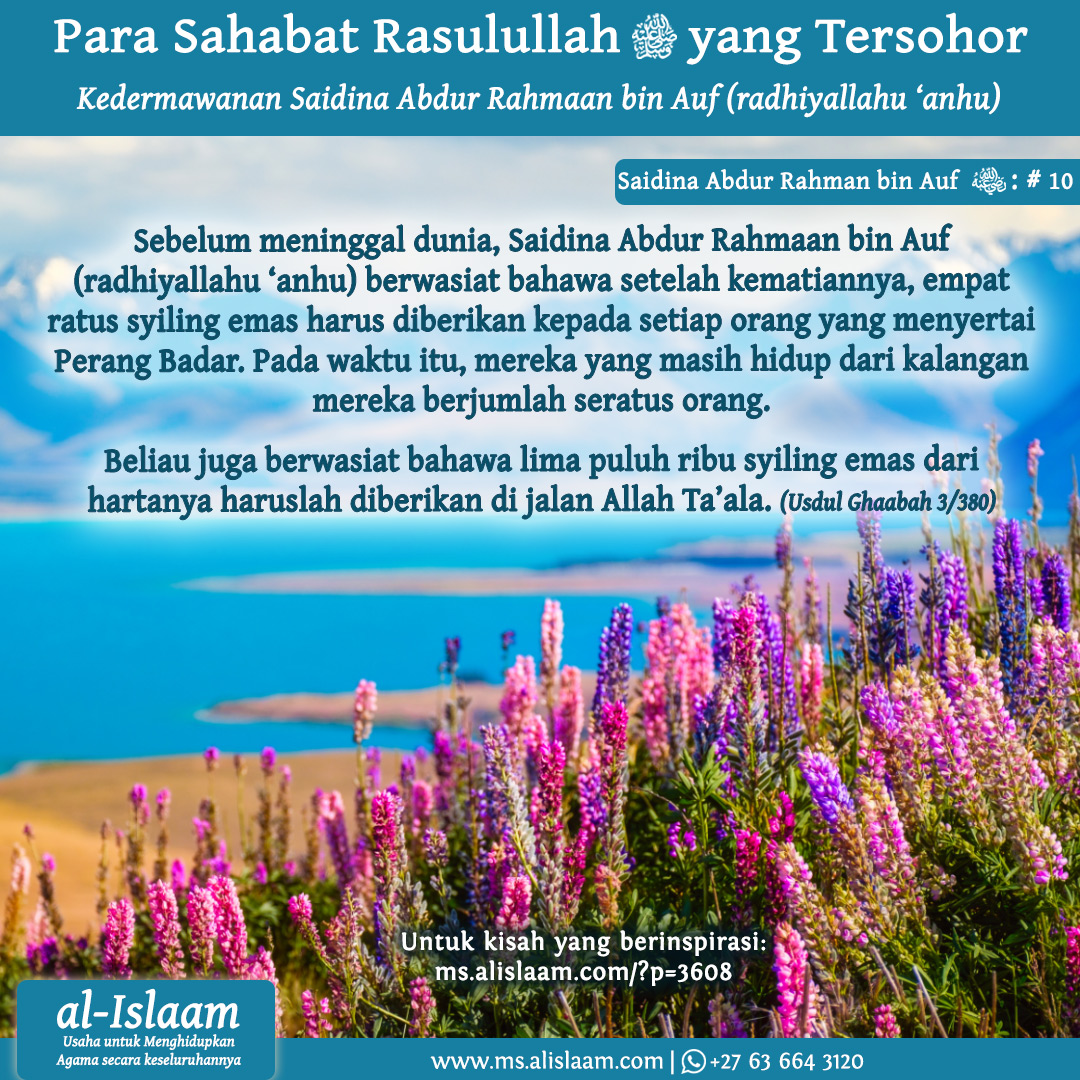 Sebelum meninggal dunia, Saidina Abdur Rahmaan bin Auf (radhiyallahu ‘anhu) berwasiat bahawa setelah kematiannya, empat ratus syiling emas harus diberikan kepada setiap orang yang menyertai Perang Badar. Pada waktu itu, mereka yang masih hidup dari kalangan mereka berjumlah seratus orang.