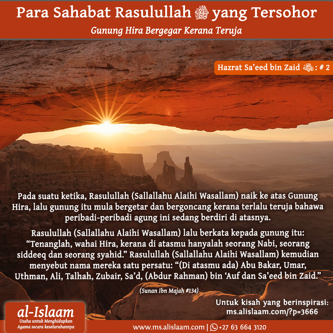“Tenanglah, wahai Hira, kerana di atasmu hanyalah seorang Nabi, seorang siddeeq dan seorang syahid.” Rasulullah (Sallallahu Alaihi Wasallam) kemudian menyebut nama mereka satu persatu: “(Di atasmu ada) Abu Bakar, Umar, Uthman, Ali, Talhah, Zubair, Sa’d, (Abdur Rahman) bin ‘Auf dan Sa’eed bin Zaid.” (Sunan Ibn Majah #134)